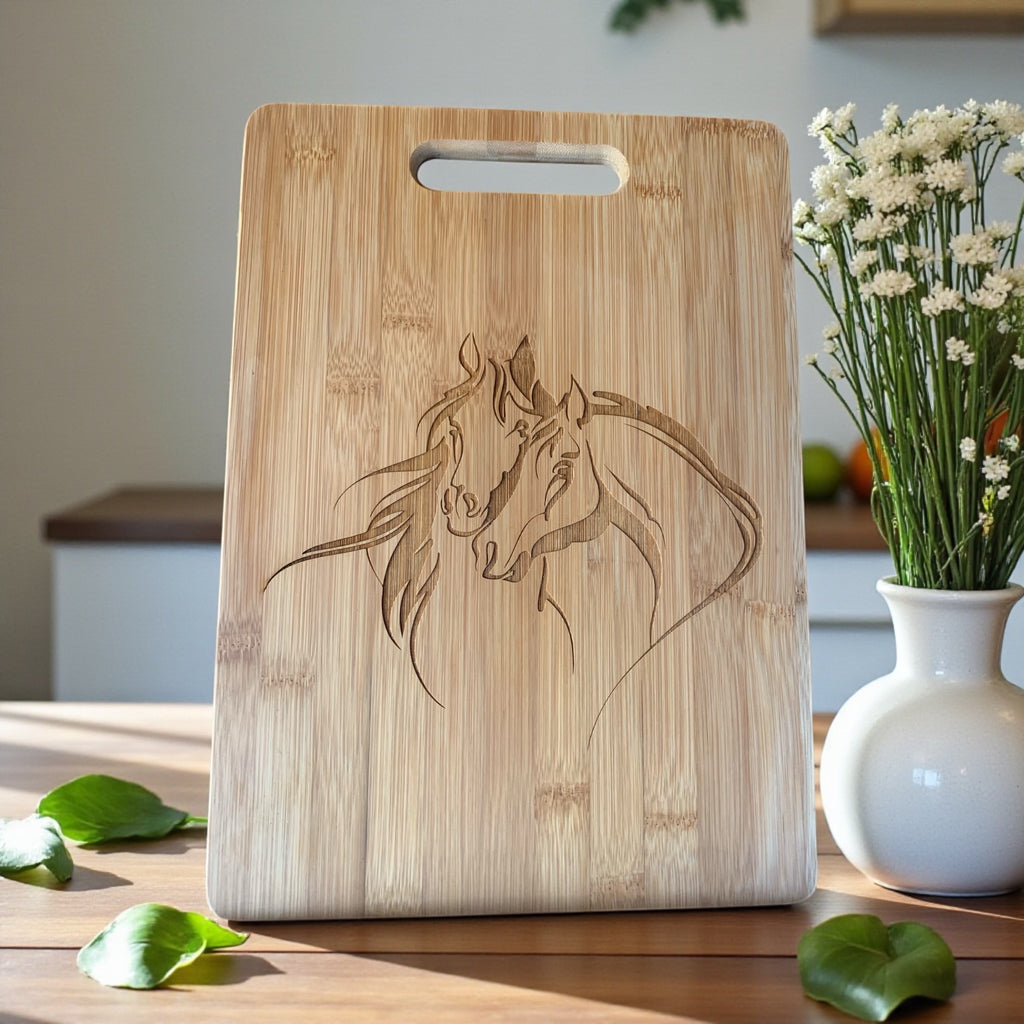 This product is a beautiful bamboo board with a double horse head design. It is available in 4 sizes.