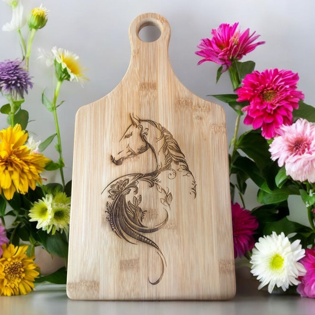 This product is a beautiful bamboo board with a horse looking backwards design. It is available in 4 sizes.